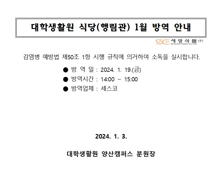 대학생활원 식당 1월 방역 안내