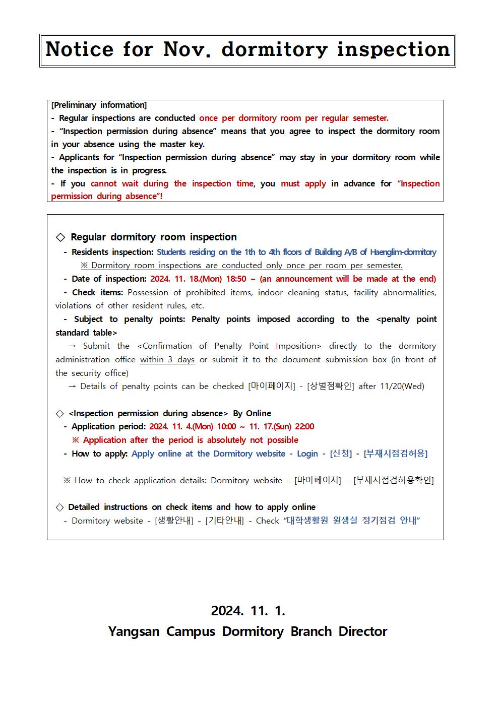[시설] 11월 원생실 점검 실시 안내